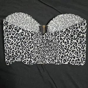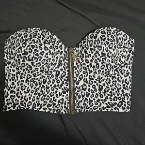 Leopard print bustier with front zipper. Strapless design. Bold and stylish.