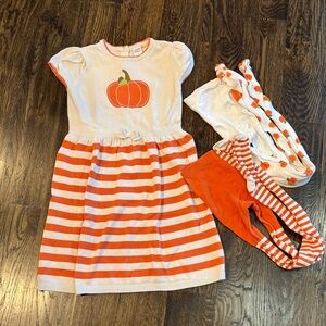 Charming pumpkin-themed dress with orange stripes. Includes matching tights for a festive look. Dress size 10. Tights 10-12. There is wash wear on the tights. Dress excellent condition!