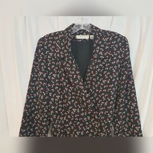 Stylish black dress with floral design fit and flare, Long sleeves and wrap style. Ideal for versatile wear. workwear. office, evenings. wedding guest, fall, patio, adjustable .1.15 " wide fabric covered belt, dry clean. has shoulder pads which can be removed, 100% polyester,