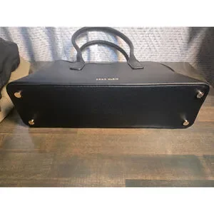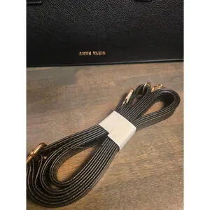 This Anne Klein black satchel bag is crafted from pebbled faux leather with gold-tone hardware. It features double top handles and a top zipper closure. The front displays the "ANNE KLEIN" logo in gold. Included are a detachable, adjustable shoulder strap and a leopard print scarf tied to a handle. The interior is lined with branded fabric, offering a zip pocket and multiple slip pockets. Four protective metal feet are on the bottom. The bag appears new.