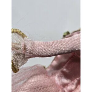 The dress is in poor condition with some wear and tear. There are snags and rips on the tule, by the arm, there is a tear in the fabric, and by the sleeves cuff, there is also a tear on the fabric.