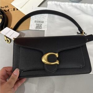 Chic Coach shoulder bag in black leather. Features a bold gold accent. Perfect for elevating any look.