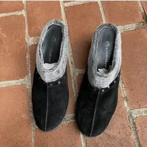 Very nice, gently worn black suede mules with faux fur trim and rubber soles size 37.