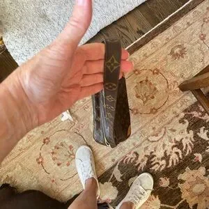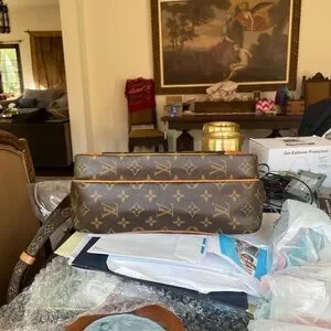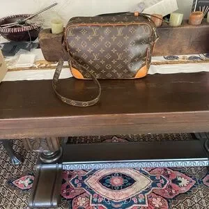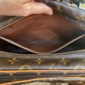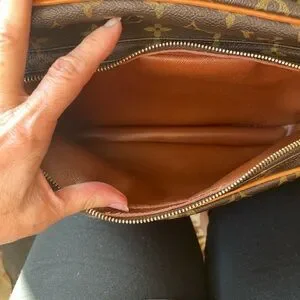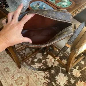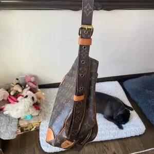 Classic Louis Vuitton monogram design. Brown body with tan accents. Adjustable strap for comfort.