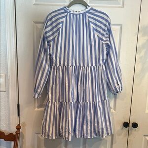 Stylish mini dress with blue and white stripes. Features a tiered design and long sleeves. Perfect for casual outings.