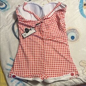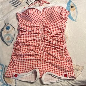 Retro Stage 1950’s red and white checkered halter neck swimsuit. NWT. Built in underwire bra with slight padding. This swimsuit is absolutely adorable, I just don’t like the way it looks on me. Size is XXL on the tag, this is a 14/16 according to their size chart.
