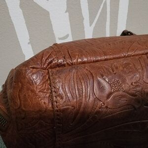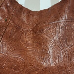 Elegant and stylish, this American Leather Co. "Austin" shoulder bag is crafted from rich brown leather and hand tooled with a floral design. Perfect for any occasion, it combines functionality with a touch of Western charm.