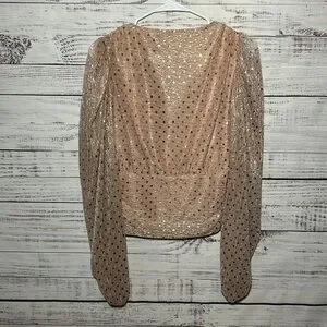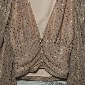 70's-inspired metallic dot blouse featuring a plunging neckline, full dramatic bell sleeves and crystal buttons.
