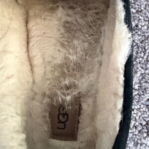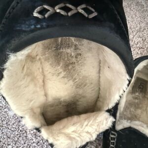 Stylish black suede shoes featuring soft cream shearling interior. Ideal for warmth and elegance.