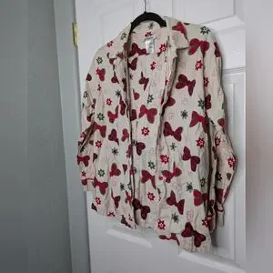 Disney Parks set was purchased at Disney World. The 2 piece flannel set is Medium in size with an elastic waistline with a red satin ribbon accent. The top has a button front closure. The set has Minnie bows in Christmas colors on the fabric.