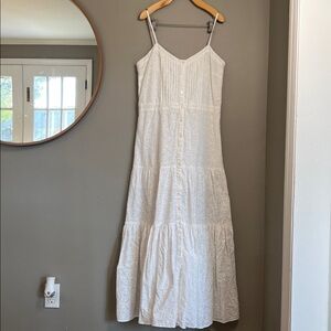 The Veronica Beard Alondra Dress is crafted from a mid-weight, non-stretch eyelet fabric. The dress features a V neckline, thin shoulder straps, and decorative buttons at the front. It has a hidden side zipper, a pleated bodice, a tiered skirt, and a ruffle hem. The dress is lined from the top to halfway down and made of 100% cotton.