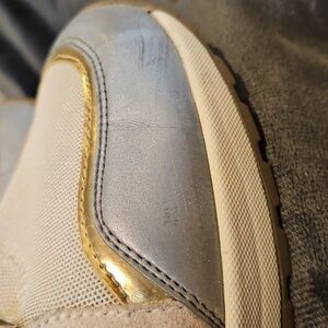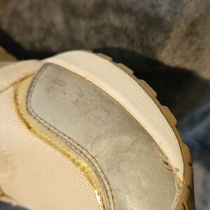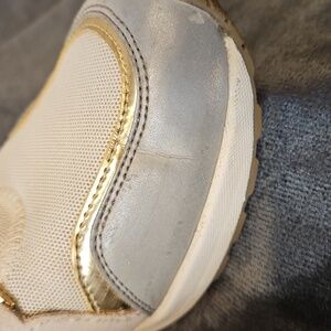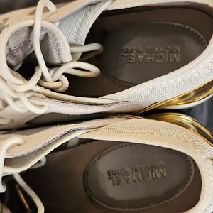 Stylish Michael Kors heeled sneakers for women. Beige with gold accents. Perfect for casual or elegant wear. See pics for wear.