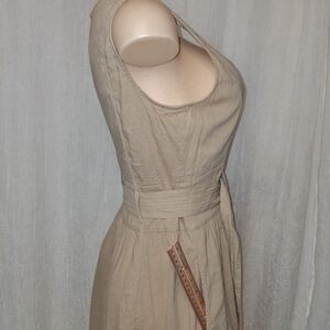 theory women size 10 Chic tan midi dress with a belted waist. Sleeveless design. Perfect for versatile styling.