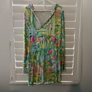 Chic bathing suit cover up with pastel hues. Features soft pink, blue, and yellow tones. Two front pockets and a hood for sun protection.