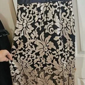 Turn heads with this stunning black and gold lace evening gown. Perfect for special occasions, this dress combines elegance and style. The intricate lace design adds a touch of sophistication.