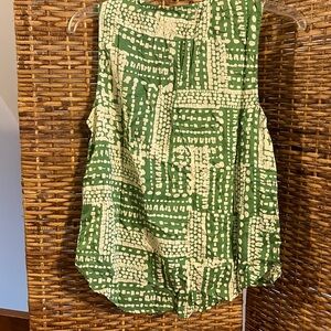 Beautifully draped wrap front sleeveless blouse with abstract pattern. Snap button closure. Silky and lightweight. Curved high low hem. 100% rayon. Approximate measurements Size XS Pit to pit 18” Length 19.5” (front)