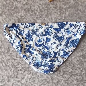 LAUREN By Ralph Lauren 2 pc elegant bikini set with a deep blue floral design on a white base. Size XL ties at the neck and base. base strap measurements are pictured