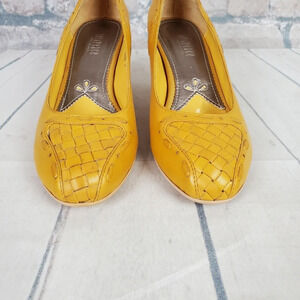 Joy & Peace Leather Heels Yellow Pumps Lattice Detail Stacked Heels Size 37
