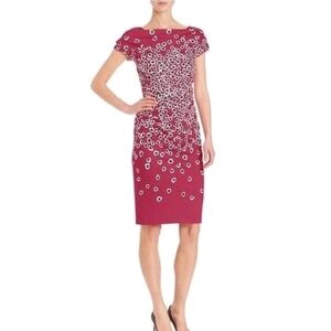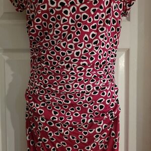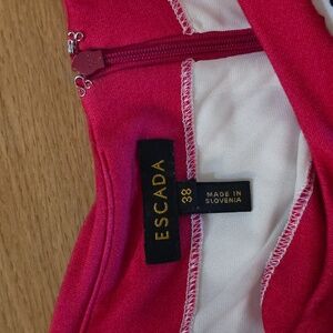 Pre-loved Escada knee length ruched heart pattern dress. Size is European 38 which translates to a US size 8, see measurements. Has stretch. Color is called "Fantasy" which is a magenta type pink with black hearts with white outlines. Boat neck which is wide and higher for chest coverage. Short sleeves that are ruched. Ruching down the sides. Zipper back with small hook closure at the top. Has a liner. Im 5'6 and it falls a few inches below my knees. The material is thick and on the heavier side. Outer is viscose and elastane, lining is acetate and polyamide. RN# 61891. CA# 02575. Style# 5021490.