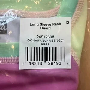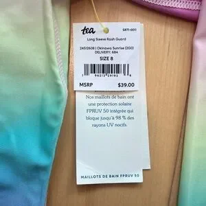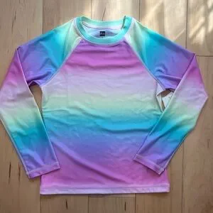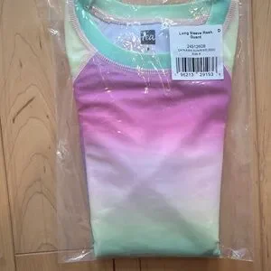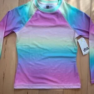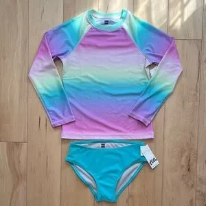 Tea Collection Rashguard and Bikini Bottoms Set in size 8. These are both NWT and in original packaging. I bought them for my daughter and she never ended up wearing them. The Rashguard is long sleeve in the Okinawa Sunrise rainbow umbrae print and the bottoms are in light Laguna color. From a nonsmoking home.
