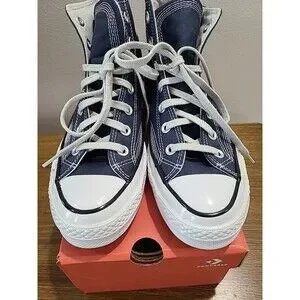 The NIB Converse CHUCK TAYLOR All Star High Top Unisex Canvas Sneakers in Navy Blue have a versatile fit for both men and women. Featuring a lace-up closure, rubber outsole, and comfortable canvas lining. With a classic high-top design and solid blue color with gray shoelaces, these Converse sneakers showcase the iconic Chuck Taylor All Star style.