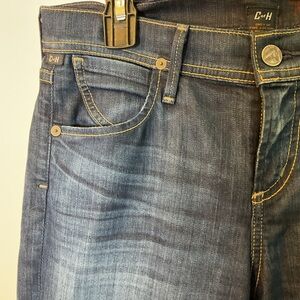 These Citizens Of Humanity jeans feature a chic cropped design, ending just above the ankle for a modern look. The dark blue denim wash with subtle fading offers a stylish, worn-in appearance. Perfect for pairing with your favorite footwear, these jeans are a versatile addition to any wardrobe.
