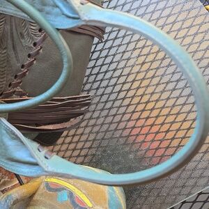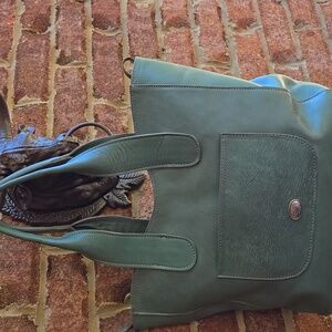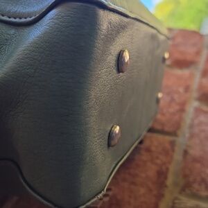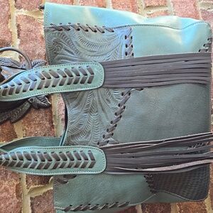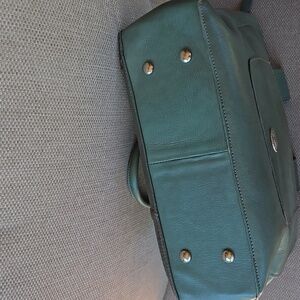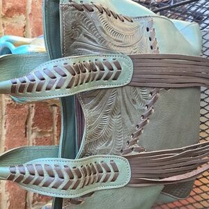 The detail in this bag is unmatched. It is in excellent condition...like new off the shelf ...still with the leather smell. It is a zipper close on the top with a thick leather pull that is easy to grab. Interior is perfectly clean with 2 small slip pockets and one zipper on either side. Large capacity to handle every need. The dark brown detailing against the grey green color is an eye catcher. The unique braiding look down the handles into the straight fringes is absolutely gorgeous. Leather treated regularly. Used once.