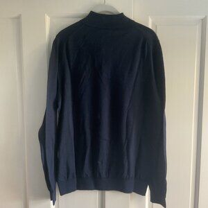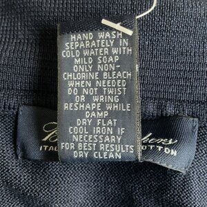 NWT Brooks Brothers men's navy blue size medium longsleeve polo sweater, made of 100% italian mercerized cotton. Three-button placket and ribbed bottom hemline and cuffs. Hand wash and cool iron, or dry clean. From a pet and smoke free home.