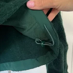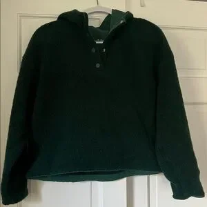 Stylish forest green fleece pullover. Perfect for outdoor activities. Hooded with drawstring at the waist. Waist length. Great condition.