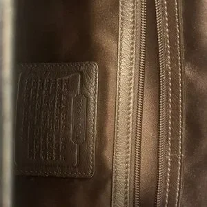 Stylish Coach shoulder bag in a stunning bronze hue. Features dual front pockets and braided handles. Ideal for any occasion.
