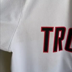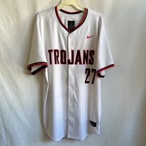 Nike USC Trojans #27 baseball jersey, size XL. Good preowned condition except for some front stains (shown) that may respond to treatment. V neck. Short sleeves. Polyester-spandex blend fabric.