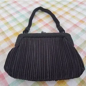 Vintage Jessica McClintock black satin evening bag with black beads. Material is gathered in a ruffle with attached strings of black beads on one side. Black beads on either side of top and wrapped around the fabric handle. Kiss lock. One slip pocket inside.