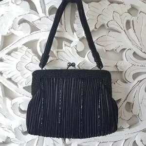 Jessica McClintock Black Beaded Evening Bag with Kiss Lock