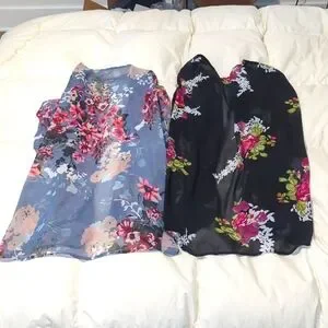 Elegant floral tops perfect for any occasion. Available in blue and black with vibrant floral patterns.