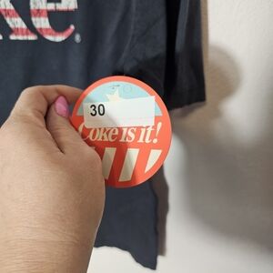 Navy blue t-shirt with 'Coke' graphic in red, white, and blue Patriotic flag.
