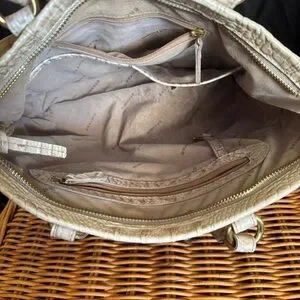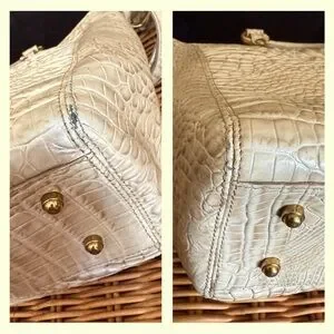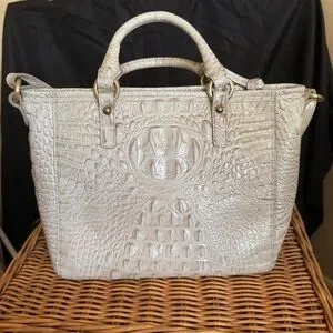 Elevate your style with the Brahmin cream crocodile embossed women's bag. Perfect for any occasion, this elegant bag combines luxury and functionality. Slight wear on bottom edges. Small interior ink stain. Measures 12”x9”x4” 9” strap drop