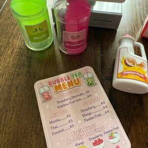 Colorful bubble tea menu with matcha, strawberry, and passion fruit flavor bottles.