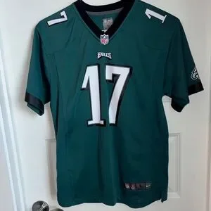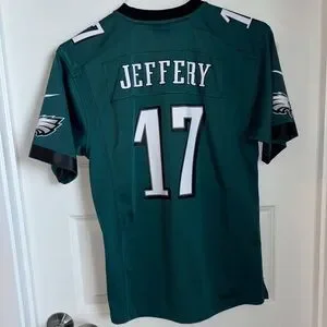 Authentic NFL On Field jersey. Features green fabric with Philadelphia Eagles NFL logo and Jeffery 17. Youth Large (14/16) and excellent used condition.