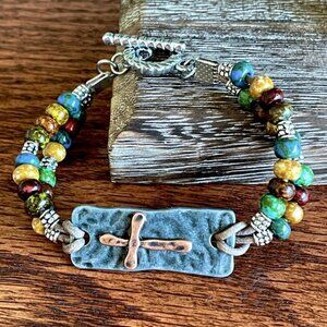 Distinctive rustic hammered metal cross charm is accented with colorful Picasso Czech glass beads strung onto genuine leather cord and secured with an antiqued silver pewter toggle clasp. The bracelet is sized for small to medium wrists and is 7 1/2 inches long. Designed and handcrafted by me. Gift box and organza jewelry bag included for gift giving or safe keeping.