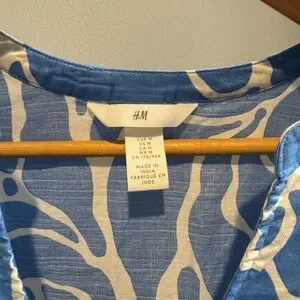 Elegant long sleeve dress with a blue and white pattern. Perfect for versatile styling.