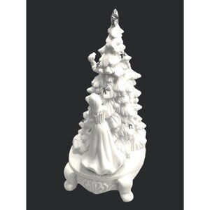 Beautiful Lenox porcelain figurine titled “First Christmas Together”. This elegant piece features a couple decorating a Christmas tree adorned with gold star accents and topped with a golden star. Crafted with Lenox’s signature ivory fine porcelain and highlighted in 24K gold. The built-in wind-up music box plays “I’m Dreaming of a White Christmas”. A charming keepsake or gift for newlyweds or collectors of Lenox holiday décor.