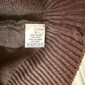 Warm, oversized brown sweater. Perfect for any occasion. Mostly polyester and acrylic.