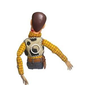 The Disney Store Pixar Toy Story Talking Woody Pull String Doll is a 15" action figure featuring the beloved character Woody from the Toy Story franchise. This original licensed reproduction doll is equipped with a pull string mechanism that activates Woody's iconic phrases from the movies. The doll also comes included with a hat, making it a must-have collectible for any Toy Story fan looking to bring a piece of the beloved movie series to life. Measurements photographed. Batteries not included. See pictures, please. Ships quickly