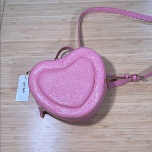 Charming pink heart-shaped crossbody bag with a glittery finish, kidcore style. Features two zippers for each side. Perfect for adding a playful touch to any outfit.