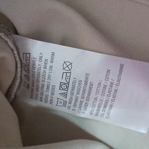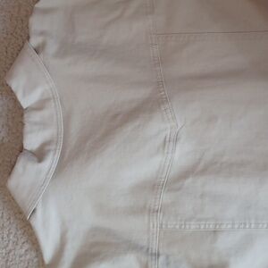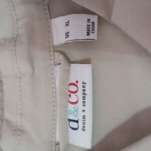 XL d&Co. tan denim jacket. full button up. buttons are silver and rhinestone. 97% cotton, 3% spandex. material has some stretch. long sleeve. collar. two buttoned chest pockets, two side pockets.there are two small spots, as pictured. one on the left shoulder, and one on the bottom of the right sleeve. otherwise the jacket is in excellent pre-owned condition.