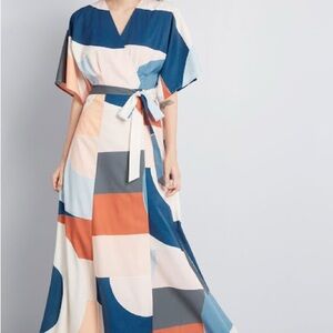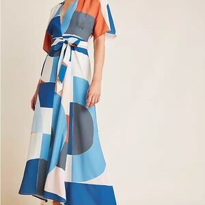 Anthropology Miro Stylish maxi dress with bold geometric patterns. Features a mix of blue, pink, orange, and cream. Perfect for any occasion.