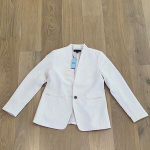 Elegant women's white collarless blazer, perfect for any occasion. Features a sleek design and comfortable fit. Ann Taylor fluid crepe clothing line. NWT.