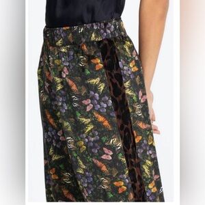 Johnny Was silk pants featuring a rich black base with an allover butterfly and floral print in earthy jewel tones. With an animal print velvet detail on the sides. Lightweight and flowy with a relaxed silhouette, elastic waistband, and luxe silk feel. Perfect for boho, resort, or elevated casual styling.