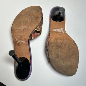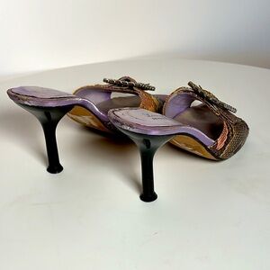 Love and desire by Beverly Feldman made in Spain, snake skin leather authentic with clear rhinestone buckles. Purple and gold heels 3 3/4" tall heel. Sexy evening vintage 90s Y2K preowned one owner me. They are still gorgeous, see all pictures before purchasing. These are preowned and they do show ware.