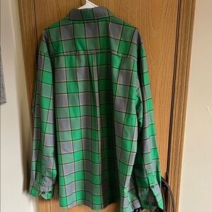 Stylish green and gray plaid button-up shirt. Features dual chest pockets and a classic collar.